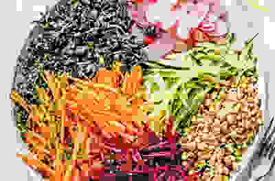 Herbs, cucumber, sweetcorn, tomatoes, grated carrot, beetroot, courgette, avocado, thinly sliced red onion – anything goes