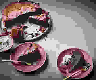 Sunken chocolate cake with passion fruit-rippled cream