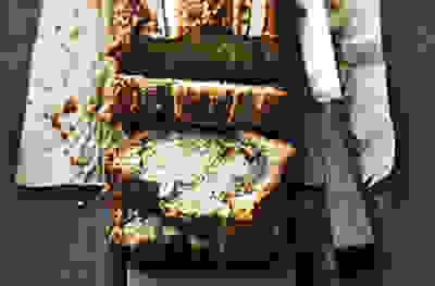 Upside-down apricot, pistachio & olive oil cake