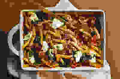 Meatball, kale & mascarpone pasta bake