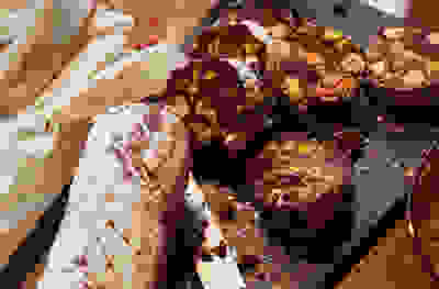 Steamed chocolate pudding with Christmas caramel sauce