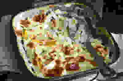 Swede, leek and potato gratin