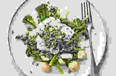 Milk-poached cod with parsley & jalapeño pesto
