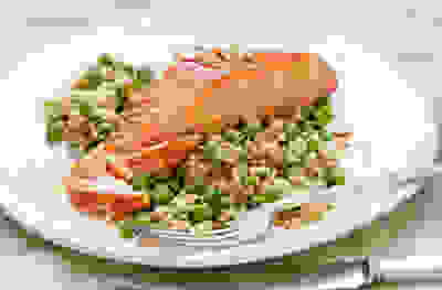 Grilled salmon fillets with pea and coriander rice