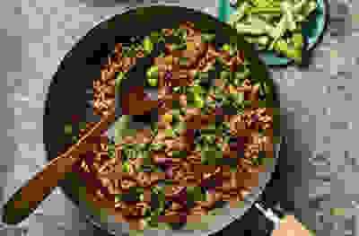 Gingered beef, cucumber pickle & greens with rice