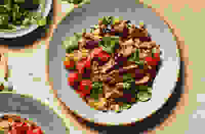 Black garlic lamb with bean crush & cherry tomatoes