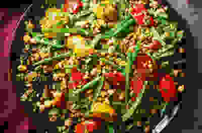 Freekeh with green beans, peppers & pistachios