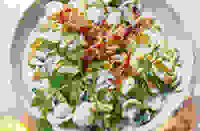 Griddled, spiced lamb with avocado houmous & herb oil
