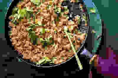 Quinoa paella with prawns & beans