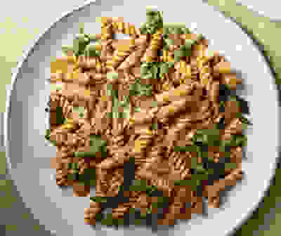 Harissa pasta & mixed nut pesto