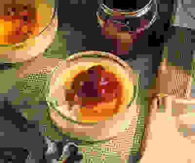 Crème brûlée with cherry compote