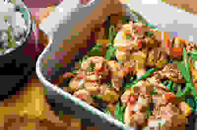 Chicken roasted with cauliflower, aubergines, raisins, pine nuts & capers
