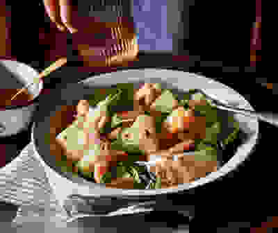 Chicken thighs with creamy leeks, beans & spinach