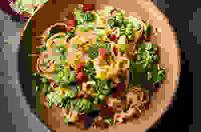 Pea & Savoy cabbage fettuccine with chorizo crumbs