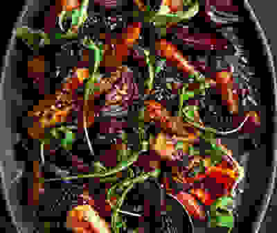 Hasselback sweet potatoes with cottage cheese & ’nduja