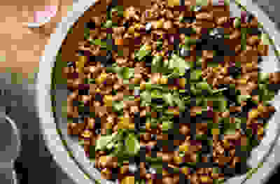Corn, pine nut & salad onion stir fry with hot smoked mackerel in piadina flatbreads
