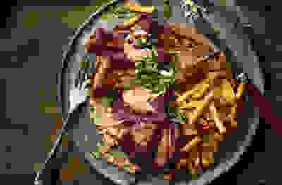 Smoked mackerel with roasted root vegetables & peppery green yogurt