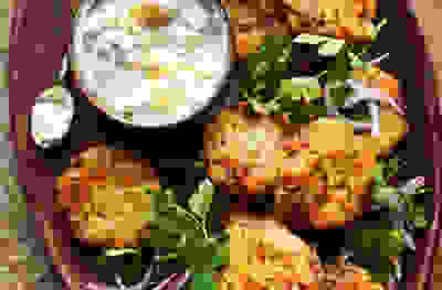 Salmon & pea fish cakes with pea, dill and cucumber salad