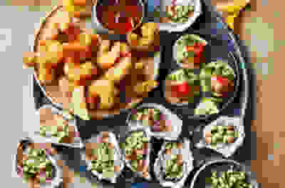 Polenta-crunch trout tacos, bean salsa & soured cream