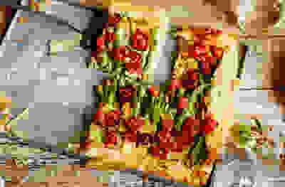 Anna Jones' sticky roasted tomato, rosemary and asparagus tart with tomato dressing
