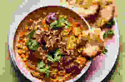 Crispy ginger lamb & tarka daal