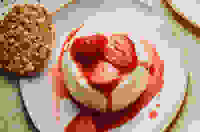Yogurt panna cotta with roasted strawberries & oat biscuits