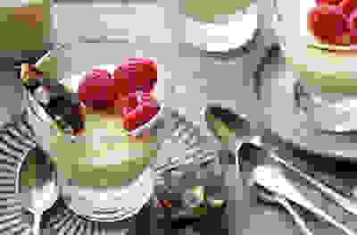 Lemon-rosemary posset with raspberries, chocolate & almond bark