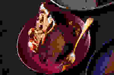 Pork chops with crackling, cider-braised red cabbage & salad onion butter