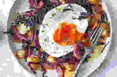 Red cabbage and roast potato hash with caramelised apples and thyme