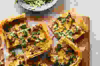 Broccoli & anchovy tart with raw shaved broccoli salad