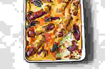 Mushroom, leek, Camembert & gnocchi tray bake