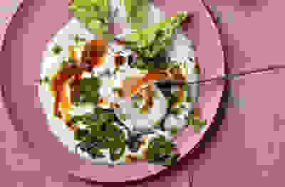 Rose harissa eggs and yogurt with avocado toast
