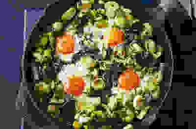 Salad onion, pea & halloumi rösti with harissa fried eggs