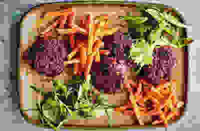 Spicy lamb & bean burgers with tahini-dressed salad and sweet potato chips