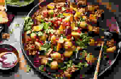 Aubergines, lentils & potatoes, with tamarind, dates and lime