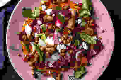 Winter vegetable chopped salad with chilli tahini dressing