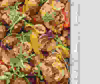 Spanish-style pulled chicken, chorizo & lentil traybake salad