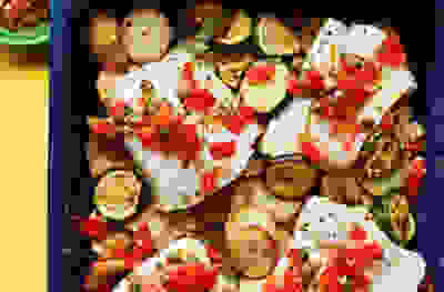 Crushed potato & halloumi traybake with summer veg