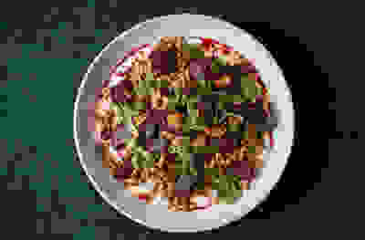 Smoky courgette dip with pine nut, chilli and mint salsa