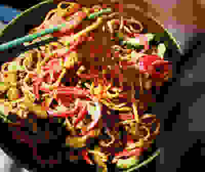 Fiery kimchi noodle stir fry with soft-boiled eggs