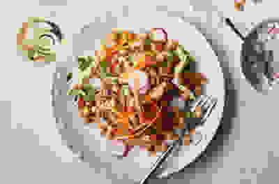 Poached chicken & chickpea salad with radish tzatziki