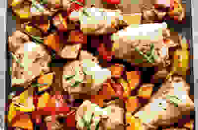Balsamic chicken & sweet potato traybake