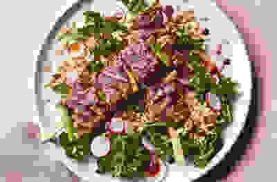 Teriyaki beef skewers with sesame rice salad
