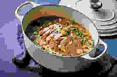 Pork shoulder with leeks, chestnut mushrooms & cream