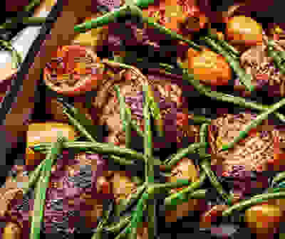 Chicken, tomato & apricot traybake with golden crispy potatoes