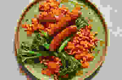 Ricotta & pepper spelt with spicy ’nduja sausages and Tenderstem