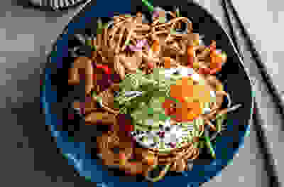 Rice noodles with prawns, dark soy sauce & sesame fried egg