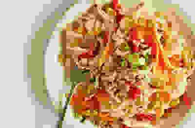 Ribboned veg, noodles & chilli prawn salad with tahini coriander dressing