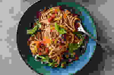 Grain bowl with stir-fried ginger vegetables, XO sauce & crispy egg