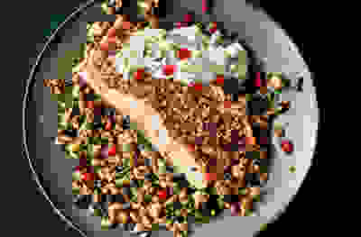 Seed-crusted salmon with herby bean & feta tabbouleh